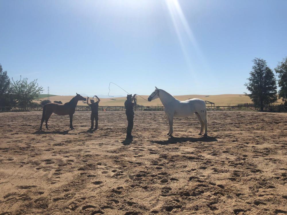 The two kinds of horses they breed exclusively at the base are the Arabian horse (left) and the Spanish/Andulusian horse (right). The Arabian horse is positioned slightly farther back in the picture, so it isn’t really that small compared to the Spanish horse. But, the Arabian horse is still built significantly smaller when compared to the stockier Spanish horse.