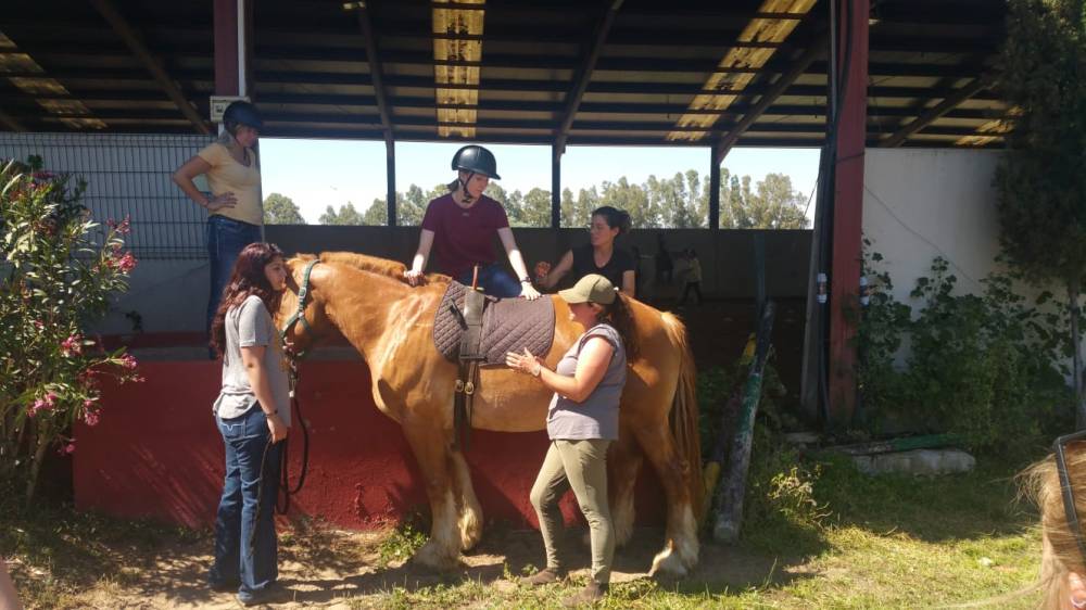 While at the stallion base (above) we also got the opportunity to witness a semen collection using a tease mare.Our second industry excursion of the day was to Terapia Equestre La Corbera in Utera. This facility uses equine assisted therapy activities as a way for individuals to improve upon any disabilites they may have. We didn’t get many pictures of the clients in action due to respect for their privacy but we did get to interact with them and help out during their sessions. We definitely get some lovely shots of us riding some of the therapy horses though and participating in some of the activities they use during sessions.